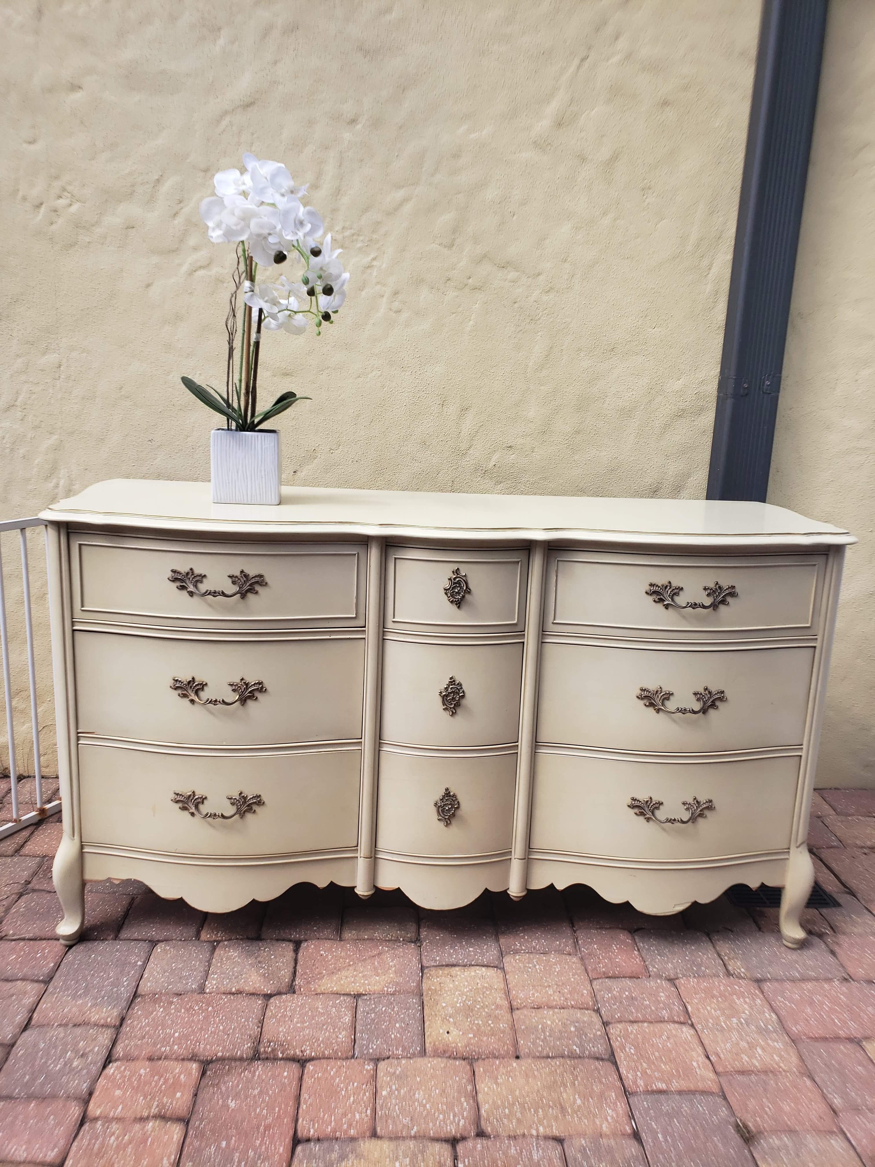 French provincial coral bassett dresser and nightstand. Reed french provincial bedroom set bow tie tuesday treasures. Both the 5 drawer dresser and it's 3 drawer sister are solid wood painted in gorgeous grey and accented in gold. Bassett french provincial bedroom furniture french provincial. Beautiful french provincial legs and trim make this set an absolute must have.